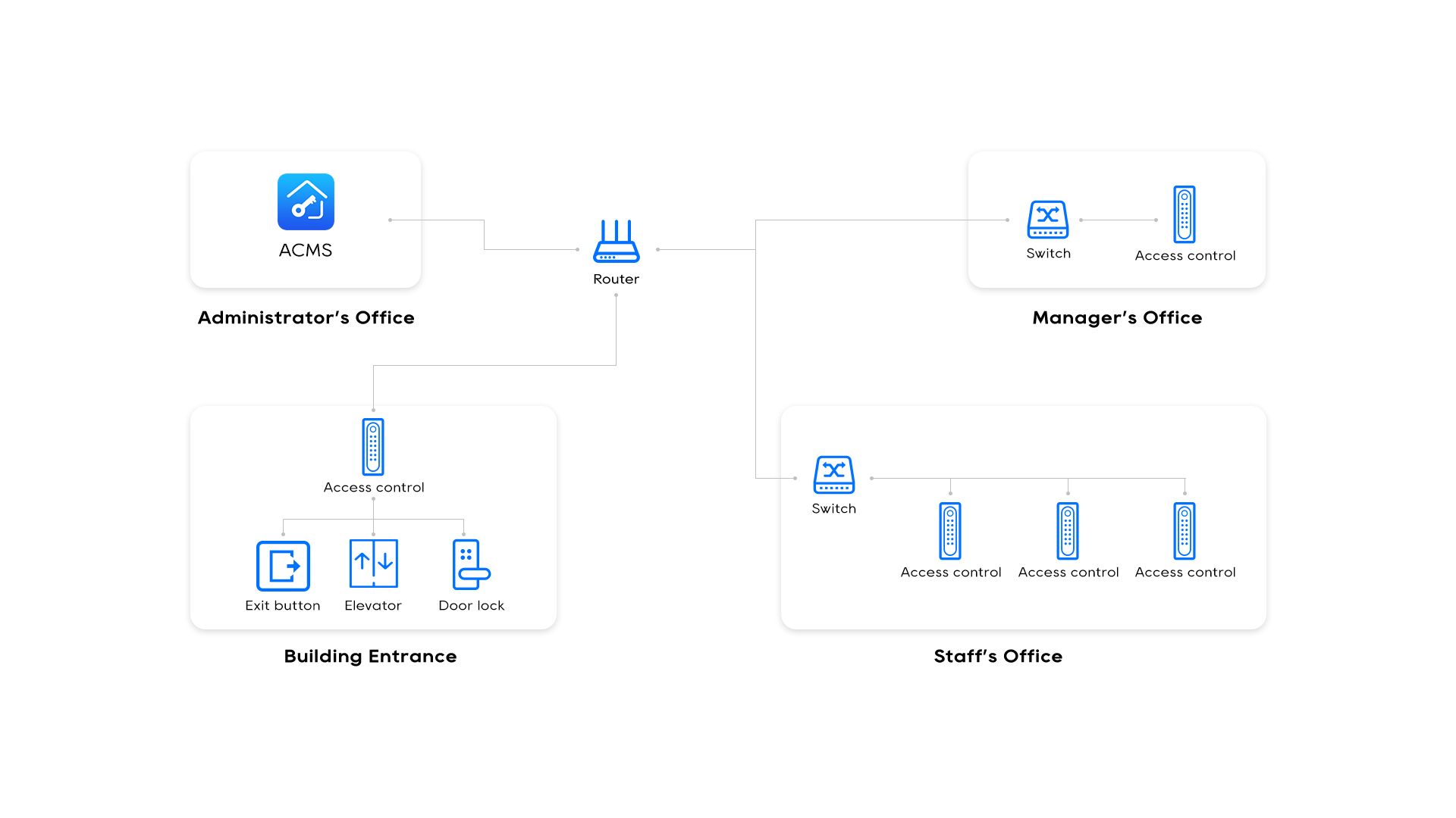 The smart intercom supports multiple authentication methods, including RFID card swipes, personal password entry, mobile app access, and facial recognition. This variety makes it easy and convenient for staff to move freely throughout the workplace.